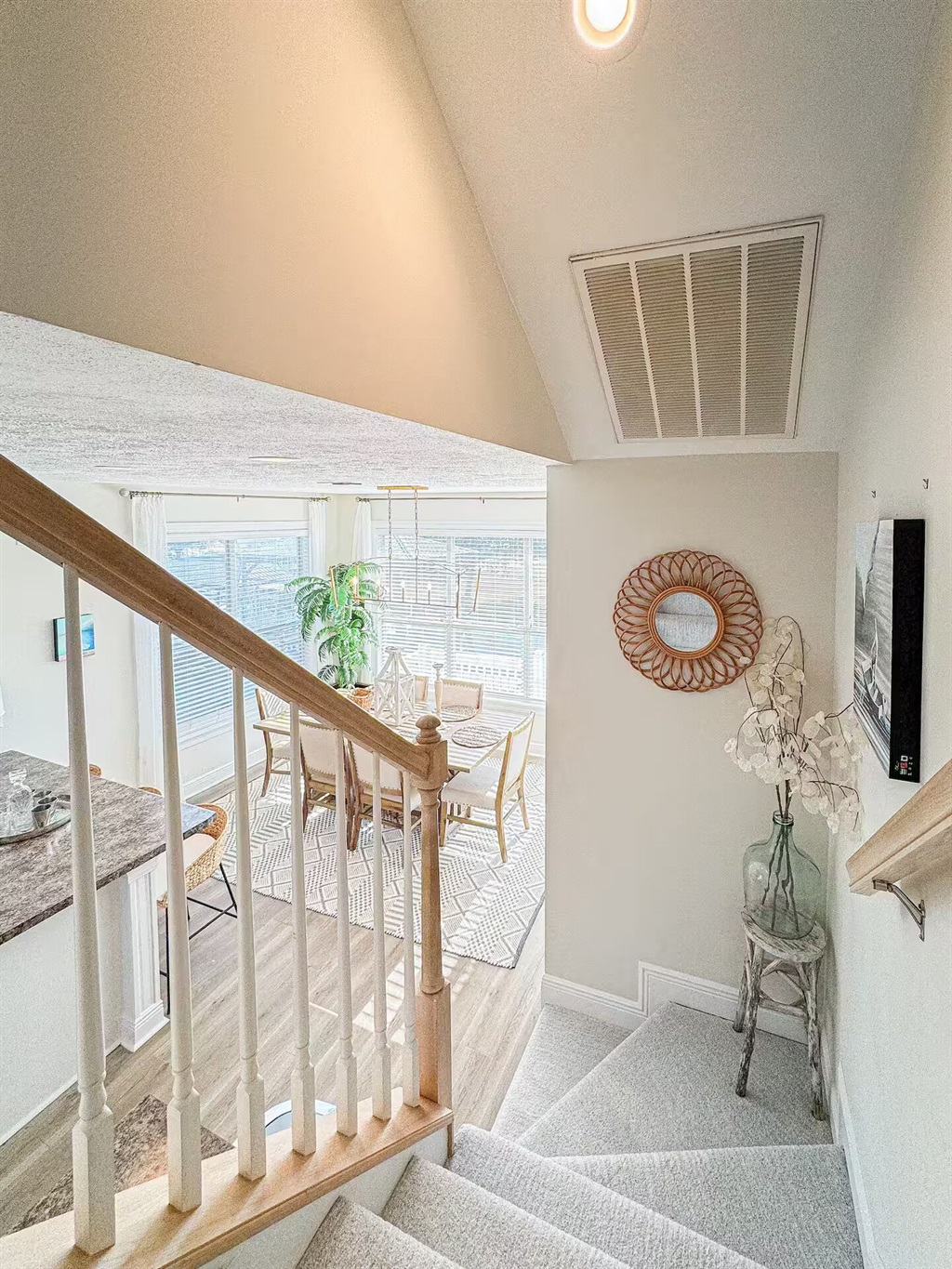 The home has an open floorplan for the dining room, kitchen and living room are all open spaces. Walk out onto the upper deck overlooking the canal off the dining room.